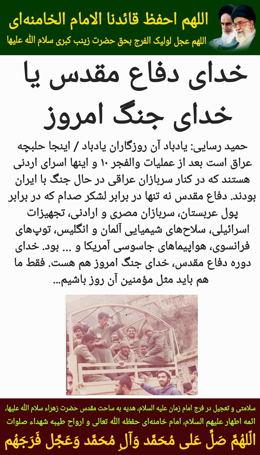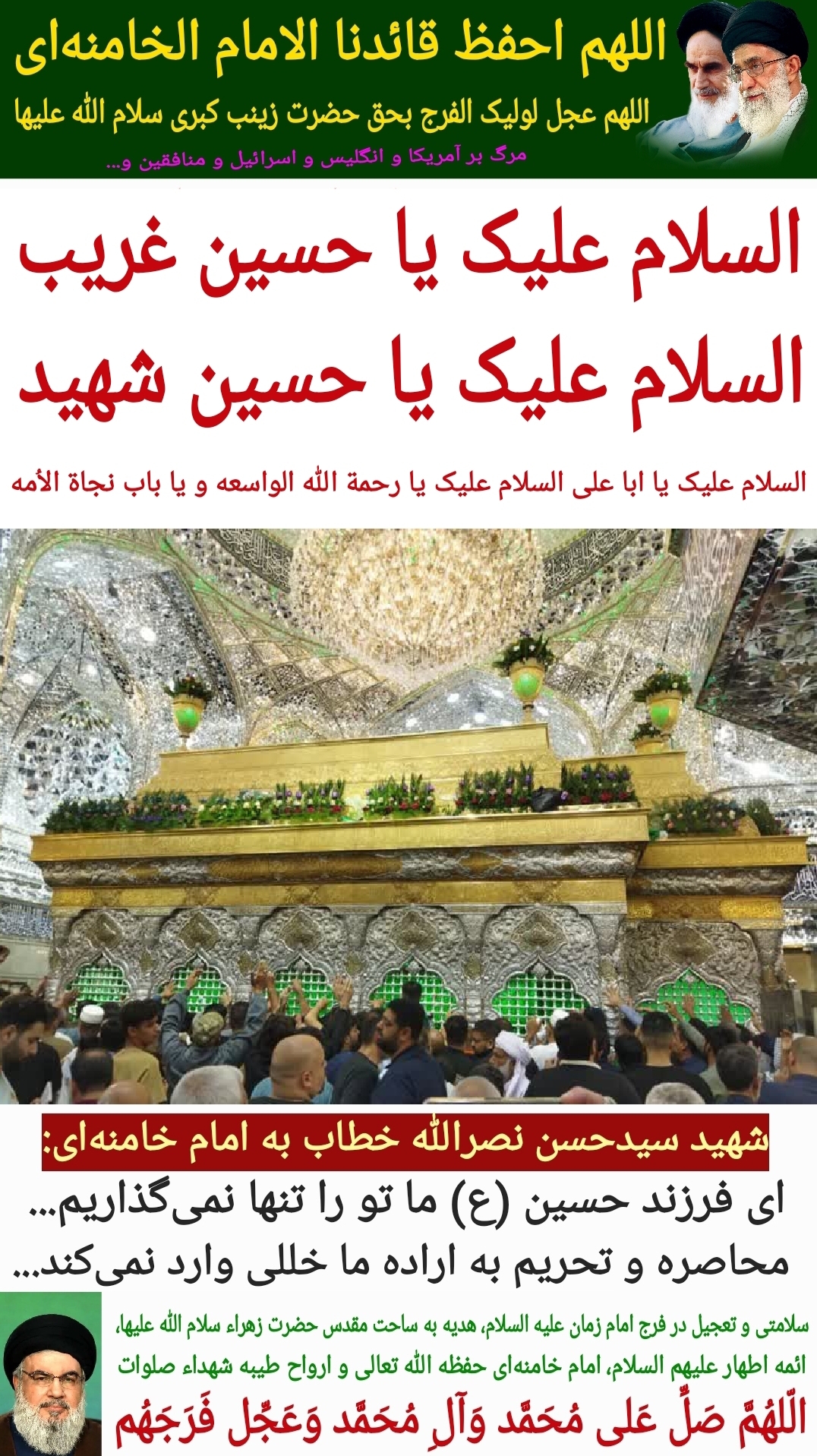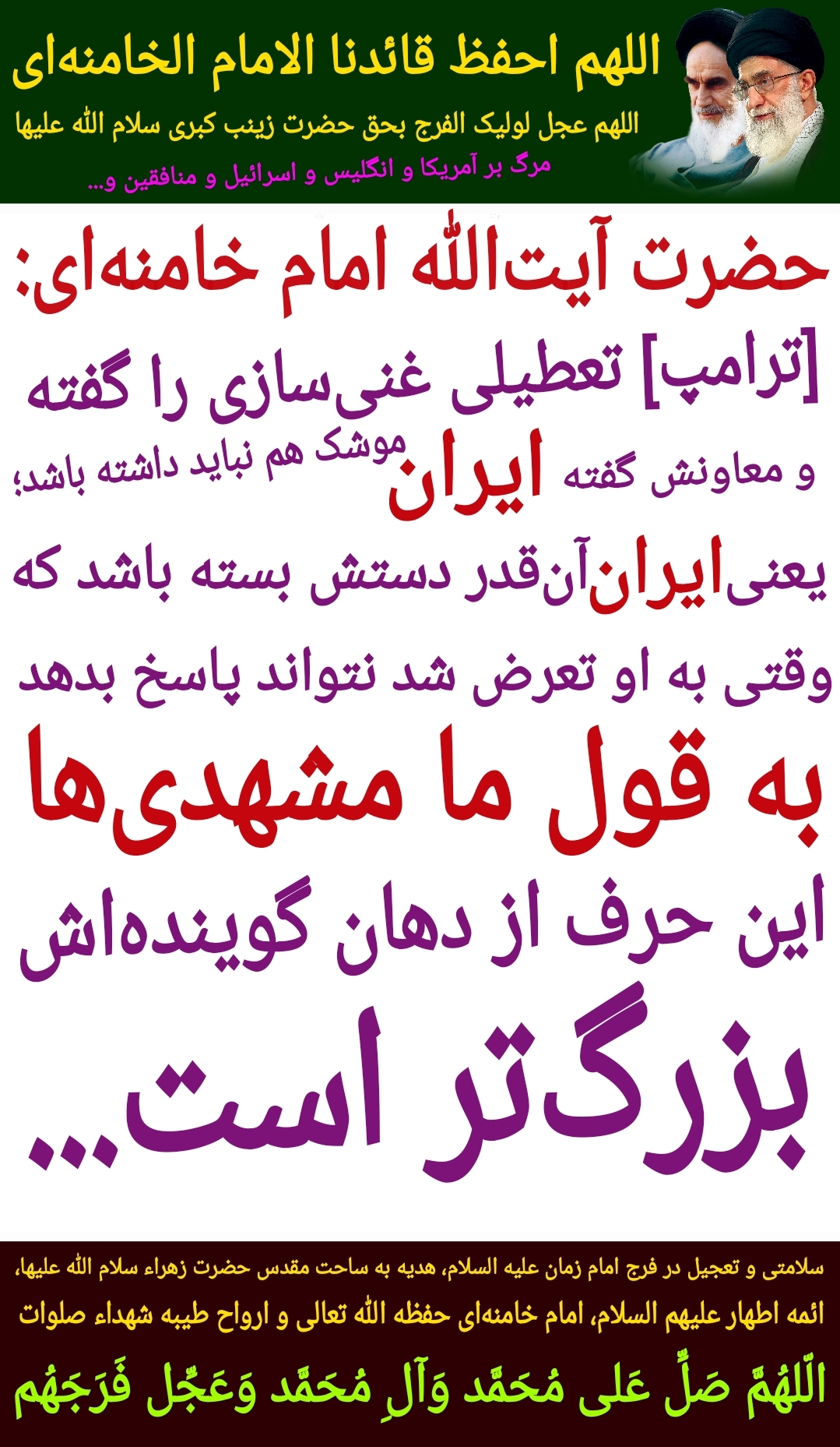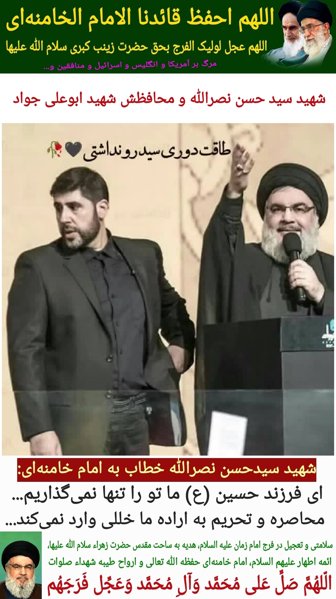 سلامتی و تعجیل در فرج امام زمان علیه السلام، هدیه به ساحت مقدس حضرت زهراء سلام الله علیها، ائمه اطهار علیهم السلام، امام خامنهای حفظه الله تعالی و ارواح طیبه شهداء صلوات