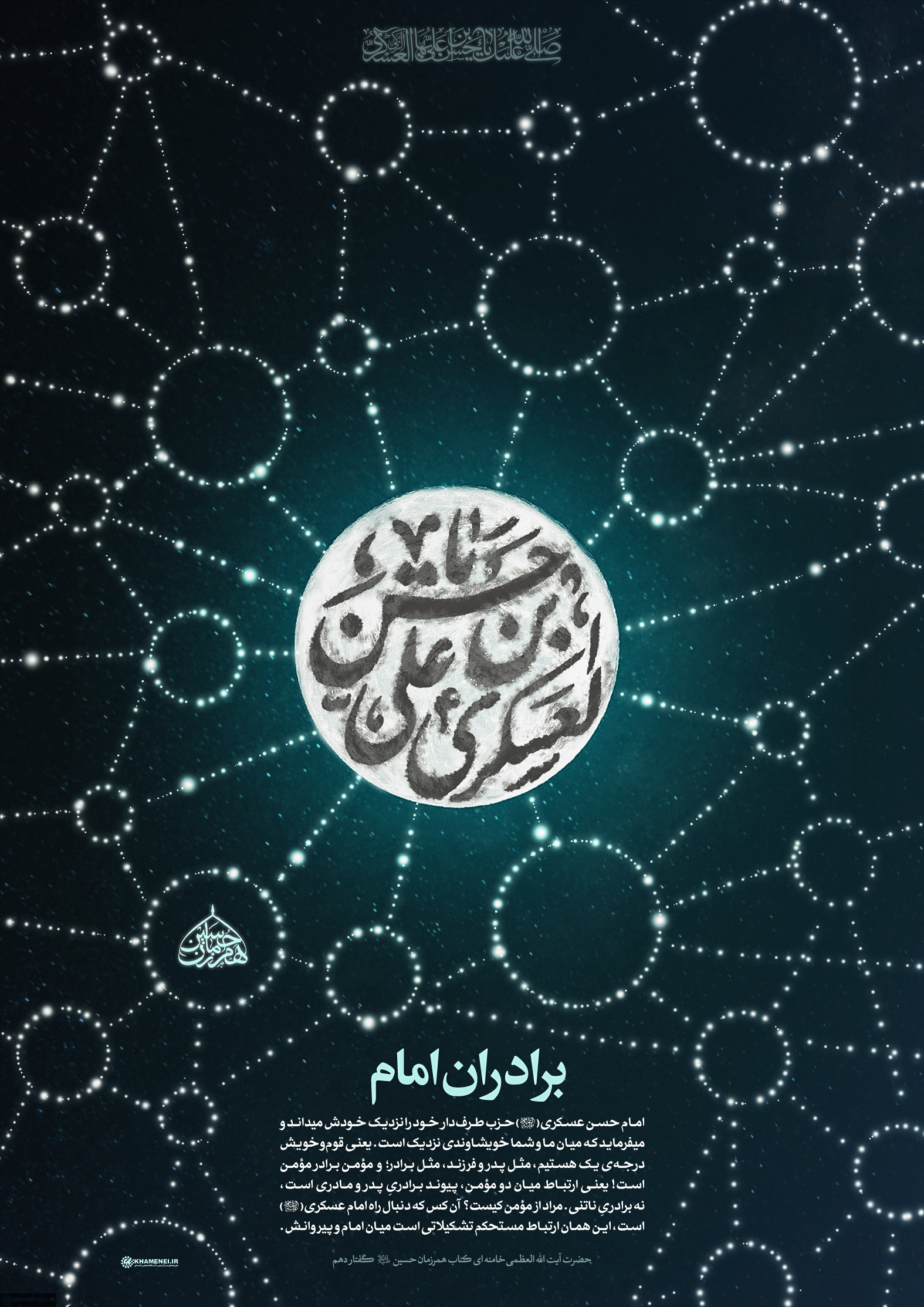 «امام حسن عسکری(علیهالسلام) حزب طرفدار خود را نزدیک خودش میداند و میفرماید که میان ما و شما خویشاوندی نزدیک است. یعنی قوموخویش درجهی یک هستیم، مثل پدر و فرزند، مثل برادر؛ و مؤمن برادر مؤمن است! یعنی ارتباط میان دو مؤمن، پیوند برادریِ پدر و مادری است، نه برادریِ ناتنی. مراد از مؤمن کیست؟ آن کس که دنبال راه امام عسکری(علیهالسلام) است، این همان ارتباط مستحکم تشکیلاتی است میان امام و پیروانش.»