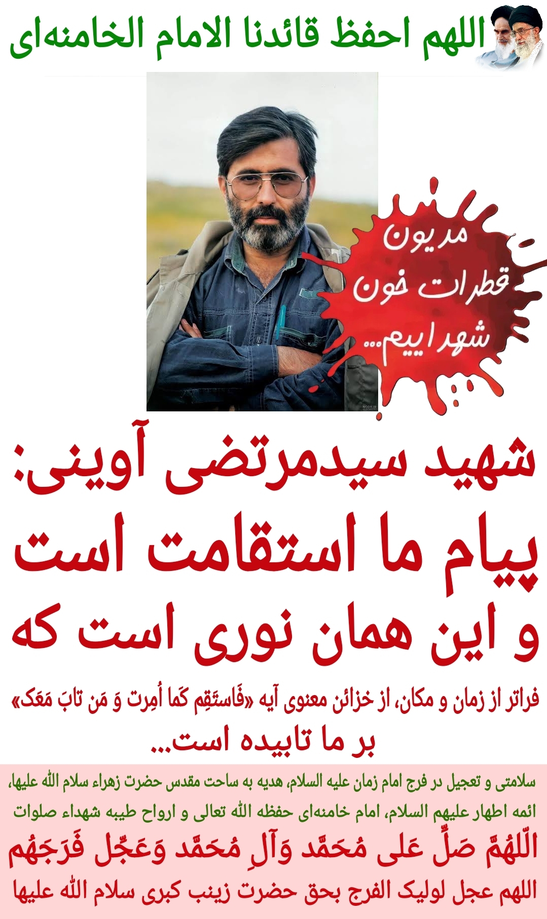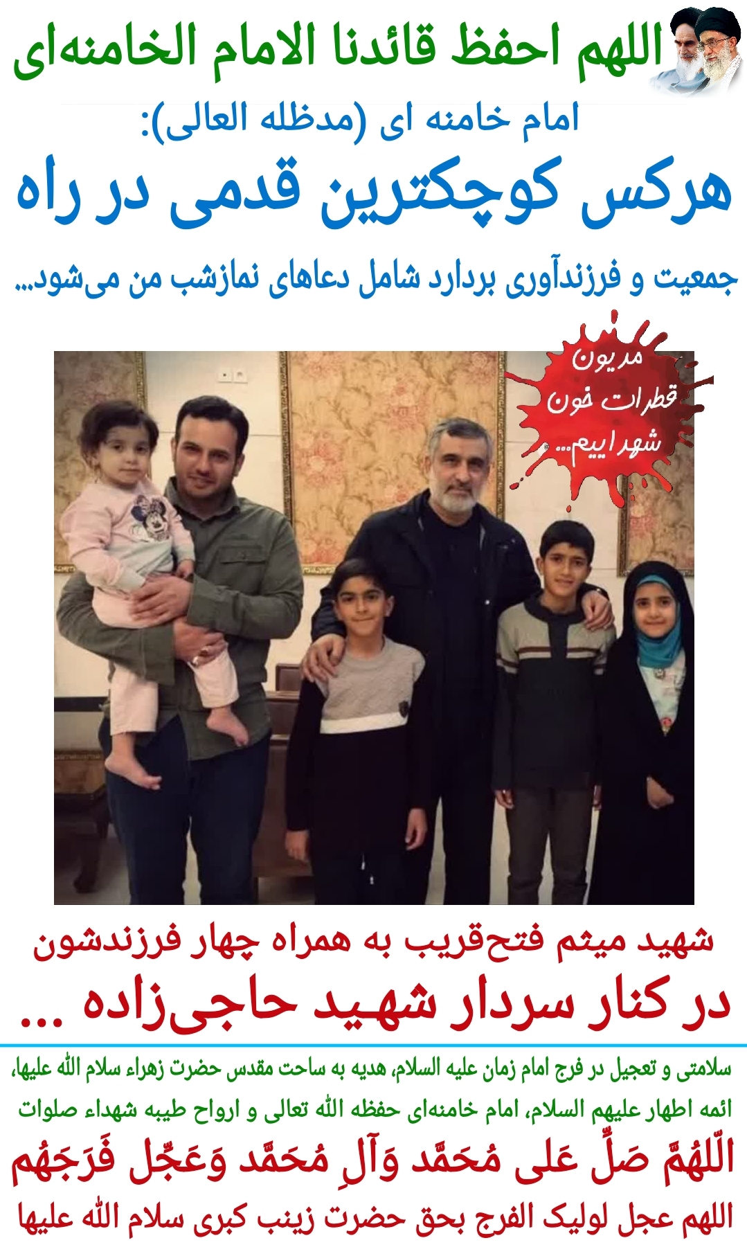 سلامتی و تعجیل در فرج امام زمان علیه السلام، هدیه به ساحت مقدس حضرت زهراء سلام الله علیها، ائمه اطهار علیهم السلام، امام خامنهای حفظه الله تعالی و ارواح طیبه شهداء صلوات