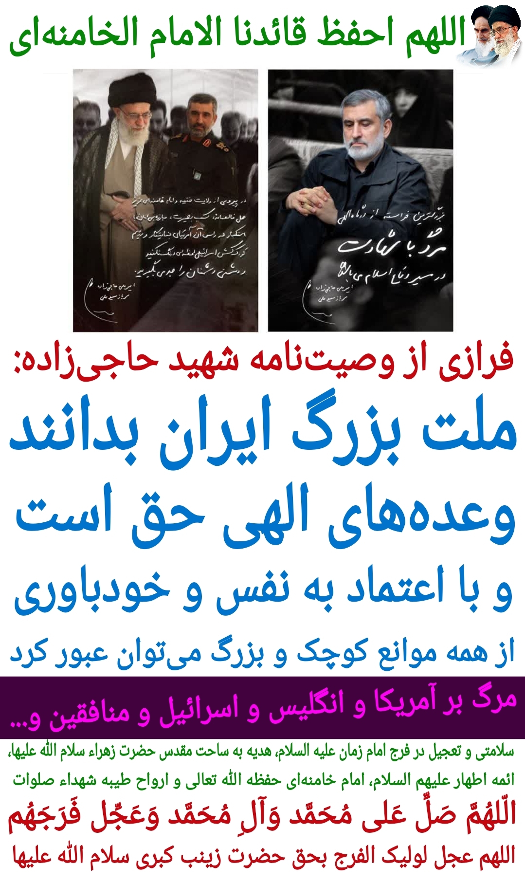 وصیتم به مردم ایران و در بعضی از قسمت ها برای مردم عراق این است که من الان حدود سه سال است که خارج از کشورم زندگی می کنم، مشکلات خارج کشور بیشتر از داخل کشور است، قدر کشورمان را بدانند و پشت سر ولی فقیه باشند. با بصیرت باشند؛ چون همین ولی فقیه است که باعث شده ایران از مشکلات بیرون بیاید ...